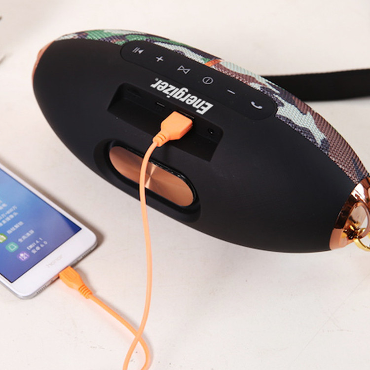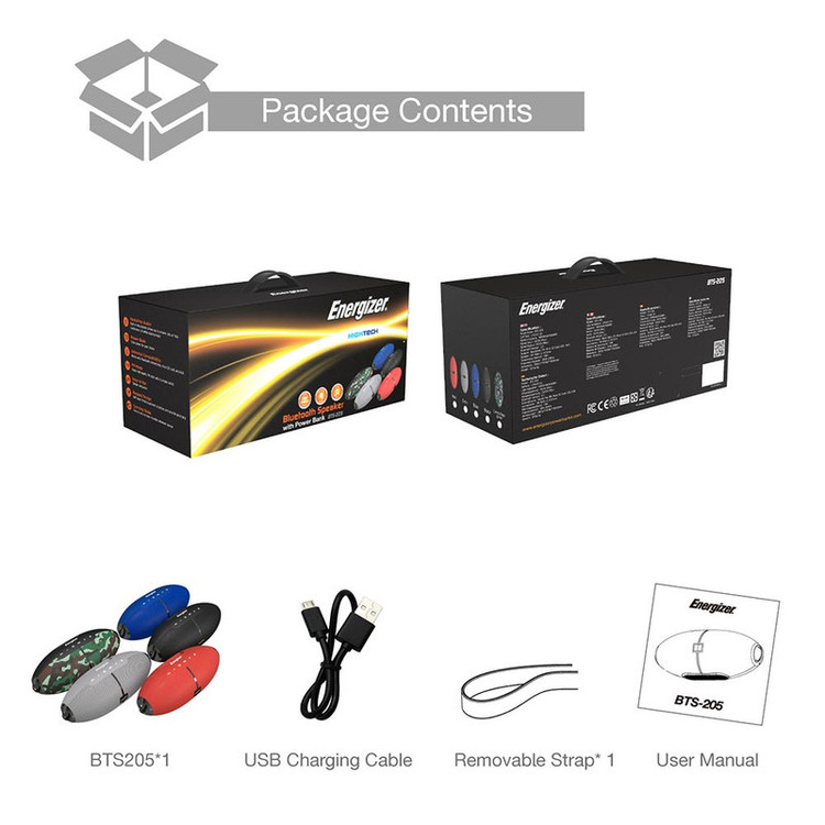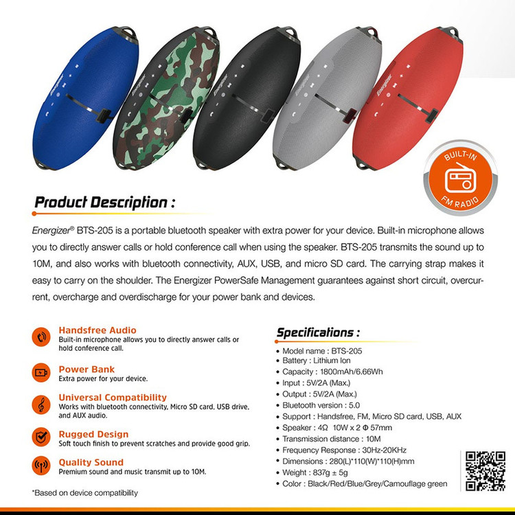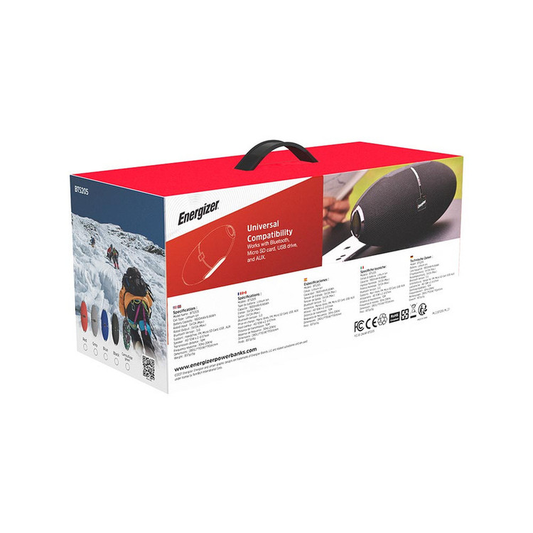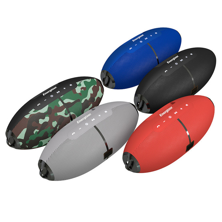 این اسپیکر بلوتوث با الهام از توپ راگبی طراحی شده است و طراحانان اسپیکر BTS205 با این ظاهر قدرت این اسپیکر را به رخ کشیدهاند. علاقه مند به گوش دادن موسیقی در هر زمان و مکانی هستید؟ آیا شما هم همیشه یک فلش مموری با آهنگ های مورد علاقه خود را همراهتان دارید؟ با اسپیکر بلوتوث مدل BTS205 انرجایزر میتوانید در هر جا به موزیکهای داخل فلش مموری خود گوش کنید. توان 10 واتی این اسپیکر تضمین کننده صدایی با کیفیت و صاف است و با فرکانس 30Hz-20kHz هرتز خود محدوده شنوایی شما را پوشش میدهد. علاوه بر فلش مموری که در بالا اشاره شد اسپیکر بلوتوث انرجایزر از رم میکرو و کابل AUX نیز پستیبانی میکند. فراموش نکنید که این اسپیکر یک اسپیکر بلوتوثی است و شما آن را به هر پلیری که قابلیت بلوتوث دارد میتوانید کانکت کنید. این محصول از رادیو FM هم پشتیبانی میکند و شما میتوانید برنامه رادیوی مورد علاقه خود را با آن دنبال کنید. امکان ویژه دیگری که در این محصول تعبیه شده است، قابلیت استفاده این محصول به عنوان پاوربانک است. یعنی با یک تیر چند نشان میزنید.