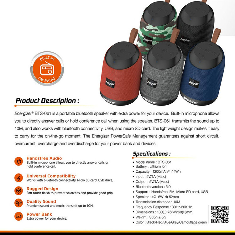 اسپیکر بلوتوثی قابل حمل انرجایزر مدل BTS061