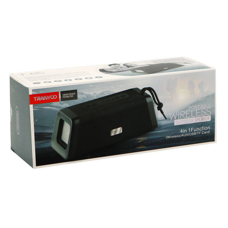 اسپیکر قابل حمل ترانیو مدل T-B5 با طراحی شیک، ابعاد جمع و جور و متریال باکیفیت و مقاوم در برابر آسیب های احتمالی مانند ضربه و فشار ساخته شده است و یک بند نیز با امکان آویز کردن و یا قرارگیری بهتر در دست جهت حمل و جابجایی راحت تر آن درنظر گرفته شده است. این دستگاه پخش کننده صوتی با وجود دو درایور 52 میلی متری و توان کلی 6 وات با حساسیت 90 دسی بل، صدای استریو 360 درجه ای و قدرتمند را در دامنه فرکانسی داینامیک 20 هرتز تا 20 کیلوهرتز به گوش می رساند. اسپیکر پرتایل Tranyoo از اتصال بی سیم پشتیبانی می کند و توسط بلوتوث نسخه 5٫0 به انواع گوشی موبایل و دیگر گجت های هوشمند متصل می شود و تا شعاع 10 متری بدون افت کیفیت به پخش موسیقی می پردازد. اتصال با سیم به دستگاه های فاقد بلوتوث مانند سیستم های کامپیوتری و … نیز به کمک رابط جک صوتی 3٫5 میلی متری و کابل AUX انجام می شود. علاوه بر این شیار کارت حافظه میکرو اس دی و پورت USB برای اتصال فلش مموری نیز برای پخش مستقیم موسیقی و دسترسی به فایل های صوتی ذخیره شده وجود دارد. میکروفون داخلی باکیفیتی نیز برای اسپیکر بلوتوثی رم و فلش خور ترانیو T-B5 فراهم شده تا تماس ها با صدایی بدون نویز و شفاف برای مکالمه منتقل شود. انرژی مورد نیاز این اسپیکر پرتابل بی سیم از طریق باتری لیتیومی به ظرفیت 1200 میلی آمپر ساعت قابل تامین می باشد که میزان نگهداری شارژ آن برای حالت پخش موسیقی و مکالمه حدود 8 ساعت خواهد بود. همچنین درصورت اتمام انرژی، باتری به راحتی توسط پورت میکرو یو اس بی و اتصال کابل مورد نظر قابلیت شارژ مجدد را دارد. در قسمت بالای پنل این دستگاه، یک سری دکمه فیزیکی به منظور کنترل مدیریت پخش موسیقی، تنظیم ولوم، روشن / خاموش کردن و … با دسترسی آسان قرار دارد.