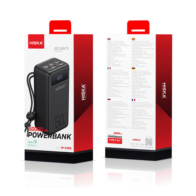 خیلی از فروشها از حالت سنتی خارج شدهاند و به صورت کاملا دیجیتال درآمدهاند. به همین دلیل شغلهای جدید زیادی وارد عرصه شدهاند و این شغلها به گونهای با گوشی و لپتاپ وابسته هستند که شاغلین چنین شغلهایی باید همیشه گوش به زنگ باشند و برای جلوگیری از اتمام باید شارژ از یک پاوربانک باکیفیت استفاده کنند تا نیازشان را به خوبی برآورده نماید. پاوربانک HISKA HP-510PD 50000mah Powerbank 22.5W Fast Charge توسط کمپانی هیسکا طراحی و تولید شده است که دارای بدنهای بسیار مقاوم در برابر آسیب و ضربه میباشد. ابعادی برابر با 159*73*54 میلیمتر داشته و وزن آن 1058 گرم است. دارای یک بند کنفی بسیار زیبا است که یک قطب نما نیز به آن متصل شده است و به راحتی میتوانید آن را حمل نمایید. این محصول برای انواع لوازمهای برقی از قبیل گوشی، تبلت، پنکه دستی و ... قابل استفاده میباشد. شارژر همراه هیسکا نه تنها برای شارژ دستگاههایتان قابل استفاده است بلکه در کمپهای شبانه هم میتواند به عنوان یک چراغقوه بسیار کاربردی عمل کند. روی بدنه آن در بخش پشتی یک چراغ LED تعبیه شده که دارای نور مناسب در دو حالت برای استفاده در تاریکی است. با توجه به شدت جریان 22.5 وات و پشتیبانی از فناوریهای شارژ سریع PD3.0 و QC3.0 در نیم ساعت باتری دستگاه را به 50% میرساند و با آیفونهای X و 11 و 12 و سایر اسمارت فون های جدید سازگار است. دارای چهار خروجی است که سه تای آنها را USB و یکی را Type-C تشکیل داده و امکان شارژ همزمان چهار دستگاه را برایتان فراهم کرده است. ورودی آن هم Type-C با شدت جریان DC 5V=3A 9V/2A 12V/1.5A میباشد. باتری از جنس لیتیوم پلیمر برای آن درنظرگرفته شده که از ظرفیت بزرگ 50000 میلیآمپر برخوردار است. گواهینامههای CE / FCC / RoHS را هم گذرانده است. مکانیزم حفاظتی بالایی هم برای آن درنظر گرفته شده تا از شارژ اضافه و داغ شدن بیش از حد پاوربانک جلوگیری به عمل بیاید و با توجه به چیپ هوشمند به کار رفته در دل آن هم شارژی بهینه و درست را برای دستگاه شما به ارمغان میآورد.
