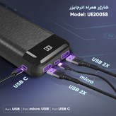 پاوربانک UE20058 از سری پاوربانکهای 20000 میلیآمپرساعتی کمپانی «انرجایزر» با طراحی مدرن و رویهای از جنس پلاستیک است. این محصول در راستای تأمین شارژ تلفنهای هوشمند، تبلتها و… تولید شده است. UE20058 با استفاده از ظرفیت 20000 میلیآمپرساعتی، تأمینکننده انرژی مورد نیاز برای امور روزانه شما است. پاوربانک انرجایزر مدل 20058 دارای دو درگاه خروجی USB است یعنی شما میتوانید دو دستگاه متفاوت را بهصورت همزمان شارژ کنید. این پاوربانک جدید دارای دو پورت ورودی است که یکی از آنها MicroUSB و دیگری USB Type-C است. میتوان با شارژر مناسب (ترجیحاً 2 آمپر و بیشتر) این پاوربانک را فول شارژر کرد. این محصول دارای نمایشگر LCD است که میزان شارژ باقیمانده را نمایش میدهد. توجه داشته باشید در پاور بانکهای LCDدار، نوسان پاوربانک در جلوی دید شماست. در بعضیاوقات شما میبینید که پاور با سرعت بالا در حال شارژ شدن است و در برخی زمانها در حالت شارژ گوشی متوجه میشود که سرعت کم شدن عدد شارژ داخلی پاوربانک بیشتر از قبل است که تمامی این موارد طبیعی بوده و اینکه پاوربانک در حال شارژ اولیه 20 درصد یا شارژ آخر 80 درصد باشد یا اینکه در حال تخلیه است کاملاً زمان تغییر عدد متفاوت است.