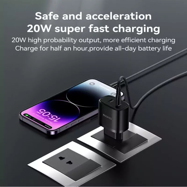 یسیدو YESIDO YC54 با توان خروجی 20 واتی فست شارژ از جنس پلاستیک با کیفیت pc ضد شعله و عایق است در برابر ضربه مقاوم و طراحی کوچک آن مناسب جابه جایی است. ورودی این شارژر دو شاخه EU سازگار با پریز های ایرانی است. کلگی دو پورت خروجی Type C با توان خروجی 20 وات میتواند دو دستگاه همزمان شارژ کند. این کلگی از جنس PC در برابر حرارت مقاوم است و با دمای ثابت دستگاه ما را شارژ میکند و محافظ باطری است. این کلگی یک کابل همراه TypeC/Lightning به طول 1 متر از کنفی مقاوم دارد. این شارژر مناسب انواع گوشی ها و تبلت ها است. این شارژر دیواری مجهز به فناوری PPS PROTOCOL است.