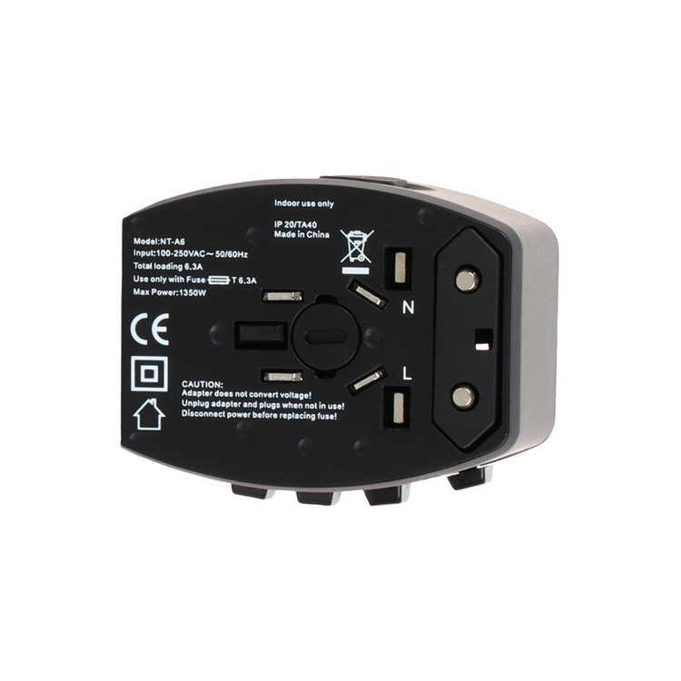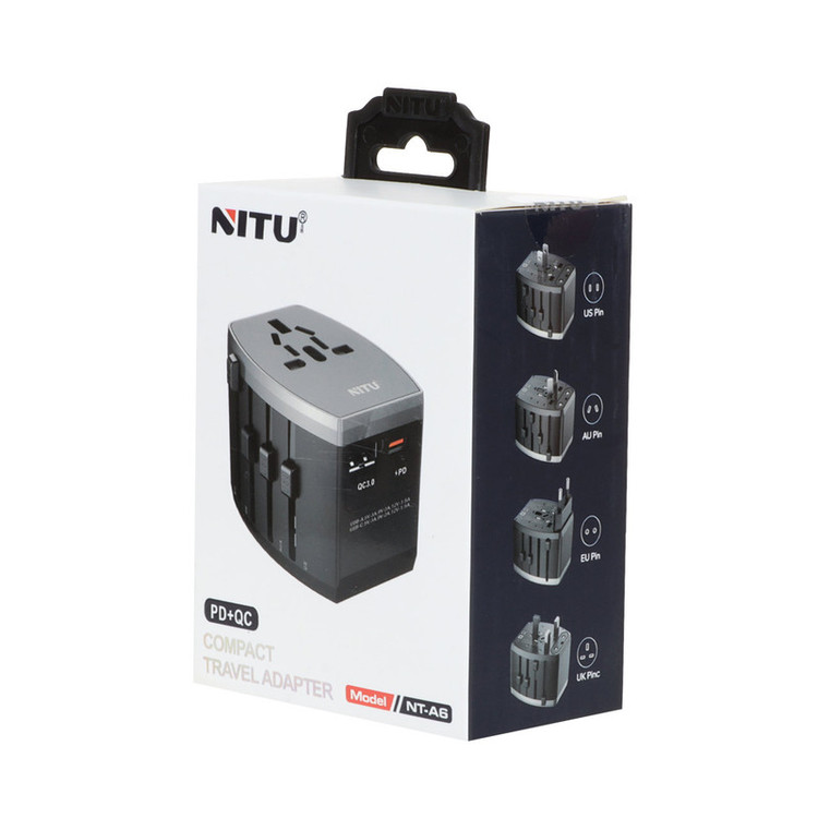 آداپتور برق نیتو NITU A6 محصولی از کارخانه نیتو است. این آداپتور با چند پین مختلف مطابق با پریزهای کشور های مختلف مناسب مسافرت طراحی شده است.آداپتور در سایز 65x54x51 و وزن 116 گرم سبک و کوچک مناسب جا به جایی است.از جنس PC و COPPER می باشد.دارای پین های US / AU / EU / UK است و با کلید های کشویی روی آداپتور قابل انتخاب هستند.آداپتور NITU A6 دارای خروجی PD TYPE-C و QC3.0 USB است.ولتاژ ورودی آداپتور 100V تا 250V است.ولتاژ خروجی 5V/3A , 9V/2A , 12V/1.5A است