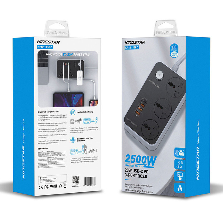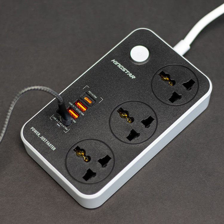 برند کینگ استار (KINGSTAR) پس از تولید موفق کالاهای الکترونیک و ورود بازار ایران، به تولید لوازم جانبی از جمله سه راهی برق روی آورد و محصولات باکیفیت و قیمت مناسبی را روانهی بازار کرد. چند راهی برق کینگ استار مدل KPS5145PD به 3 پورت USB و 1 پورت تایپ سی مجهز شده است که به کمک آنها میتوان با اتصال انواع سیم شارژ یا شارژر، دستگاههای دیجیتال و موبایل را به سادگی شارژ کرد. این پورتها که از فناوریهای QC3.0 و PD3.0 پشتیبانی میکنند، دارای نرخ جریان ولتاژ زیر هستند: USB-A: 5V/3A , 9V/2A – 12V/1.5A (18W Max – QC3.0) USB-C: 5V/3A , 9V/2.2A – 12V/1.67A (20W Max – PD3.0) همچنین سه پریز یونیورسال (سه شاخه) نیز دارای شدت جریان خروجی 10 آمپر و حداکثر توان خروجی 2500 وات خواهد بود.