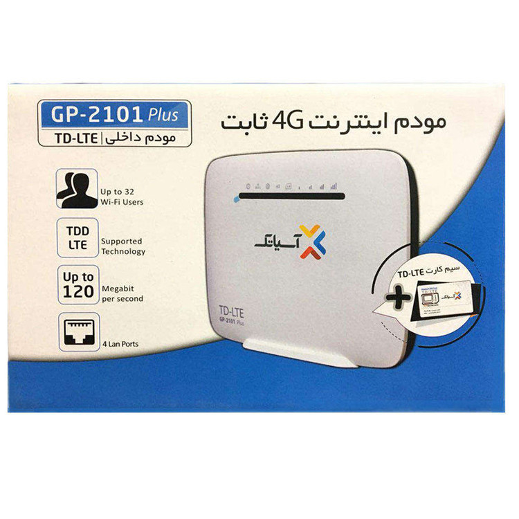 مودم «GP-2101plus» محصولی جدید شرکت آسیاتک است که در گروه مودمهای TD-LTE قرار گرفته و علاوه بر ارائه اینترنت پرسرعت، قابلیت برقراری خطوط تلفن آسیاتل (تلفن ثابت آسیاتک) در مناطق فاقد امکان ارائه خطوط مخابراتی را فراهم می آورد. این مودم به صورت رومیزی طراحی شده است و از چهاردرگاه LAN برای اتصال تجهیزات بهصورت باسیم به اینترنت بهره میبرد. وجود این درگاهها باعث شده که به راحتی بتوان از این مودم در کامپیوترهای قدیمی هم بهره برد. برای اتصال تلفنهمراه، تبلت و لپتاپ به اینترنت بهراحتی میتوان از رابط اتصال بیسیم (WiFi) مودم استفاده کرد. مودم TD-LTE آسیاتک مدل GP-2101plus دارای آنتن داخلی از نوع MIMO است که میتواند با سرعت زیاد اطلاعات را دریافت و ارسال کند. این محصول انرژی خود را از طریق برق شهری تامین میکند و برای استفاده از آن همواره نیاز است که مودم به برق متصل باشد. از ویژگیهای این مودم، قابلیت اتصال همزمان 32 کاربر به آن است. این موضوع باعث شده که مودم GP-2101plus انتخاب مناسبی برای استفادههای حرفهای باشد. در قسمت جلویی GP-2101plus نشانگرهای LED تعبیه شدهاند که میتوانند اطلاعات خوبی به کاربر ارائه کنند. به کمک این مودم میتوان تجربهی دانلود حداکثر تا سرعت 120 مگابیت بر ثانیه و آپلود 30 مگابیت بر ثانیه را داشت.به همراه این مودم یک عددم سیم کارت TD-LTE آسیاتک به همراه 9 گیگ اینترنت عرضه میکردد که خریداران میتوانند طی تماس با شماره مندرج بر روی کارت اشتراک سرویس خود را انتخاب و فعال نمایند.از نکات مثبت این مودم میتوان به پشتیبانی از هر دو شبکه FDD و TDD و امکان استفاده از تمامی اپراتورها ضمن تغییر سیم کارت اشاره نمود.