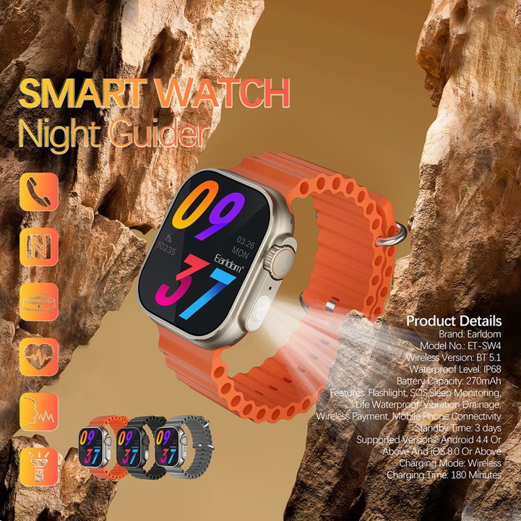 ساعتهای هوشمند به غیر اززیبایی دارای قابلیتهای بسیار کاربردی دیگر بالخصوص در حفظ و کنترل سلامتی استفاده کننده دارند برای همین شرکتهای بزرگ تولید لوازم جانبی موبایل اقدام به تولیداین دیوایس در طرحها و رنگهای گوناگون کردند وشرکت Earldom که در عرصه تولید لوازم جانبی موبایل شناخته شده می باشد نیز از این امر مستثنی نیست و با تولیدساعت هوشمندsmart watch sw4 ازبازار گجتهای پوشیدنی هوشمندجانماند.این ساعت با سیستم عامل سیستم اندروید 4.4 به بالا ios 8 سازگار است. امکانات این ساعت شامل ماشین حساب، کرنومتر، ضبط صدا، پخش موزیک های گوشی موبایل با کیفیت بسیار عالی ، امکان برقراری تماس، و امکان مشاهده تمامی تماس های ورودی و خروجی و همچنین ضربان قلب وغیره را بر روی صفحه نمایش را داراست. روشن شدن صفحه نمایش با بالا آوردن مچ دست، موفق به کسب گواهینامه مقاومت در برابر نفوذ آب IP68 و استاندارد امنیت و سلامت محصولات CE قابلیت استفاده به عنوان شاتر دوربین گوشی موبایل، مدیریت موسیقی، نمایش اعلان ها، ثبت تاریخچه تماس ها، پشتیبانی از حالت های مختلف ورزشی تامین انرژی از طریق باتری لیتیومی داخلی به ظرفیت 270mAh با قابلیت شارژ از طریق شارژر مگنتی و شارژدهی در حالت استند بای به مدت 3 روز نوع اتصال بی سیم از طریق بلوتوث نسخه 5.1، دارای میکروفون داخلی با قابلیت مکالمه، پشتیبانی از تماس بلوتوثی و پشتیبانی از زبان فارسی صفحه نمایش لمسی و رنگی به فرم صفحه مربع ساخته شده از جنس شیشه مقاوم، امکان تغییر تم ساعت و دارای واچ فیس های متنوع مجهز به سنسور های ضربان قلب، فشار و اکسیژن خون، پایش وضعیت خواب، ثبت مسافت طی شده، گام شمار، مانیتورینگ دمای بدن بدنه ساعت ساخته شده از جنس آلیاژ آلومینیوم و پلاستیک مقاوم در برابر آسیب های فیزیکی احتمالی همچون ضربه و فشار برخورداری از سنسور شتاب سنج، کرونومتر، پایش تنفس، کالری شمار، قابلیت نمایش وضعیت آب و هوا و مجهز به چراغ قوه دارای یک عدد بند سیلیکونی با قفل بند از نوع سگکی فلزی، دارای قابلیت پیدا کردن گوشی موبایل و اپلیکیشن اختصاصی SZOS